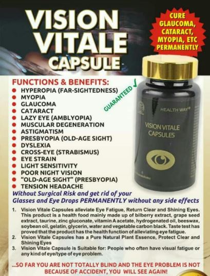 THE VISION VITALE CAPSULES is a Health Food mainly made up of Bilberry Extract, Grape Seed Extract, Taurine, Zinc Gluconate, Vitamin A Acetate, Hydrogenated Oil, Beewax, Soybean Oil, Gelatin, Glycerin, Water and Vegetable.